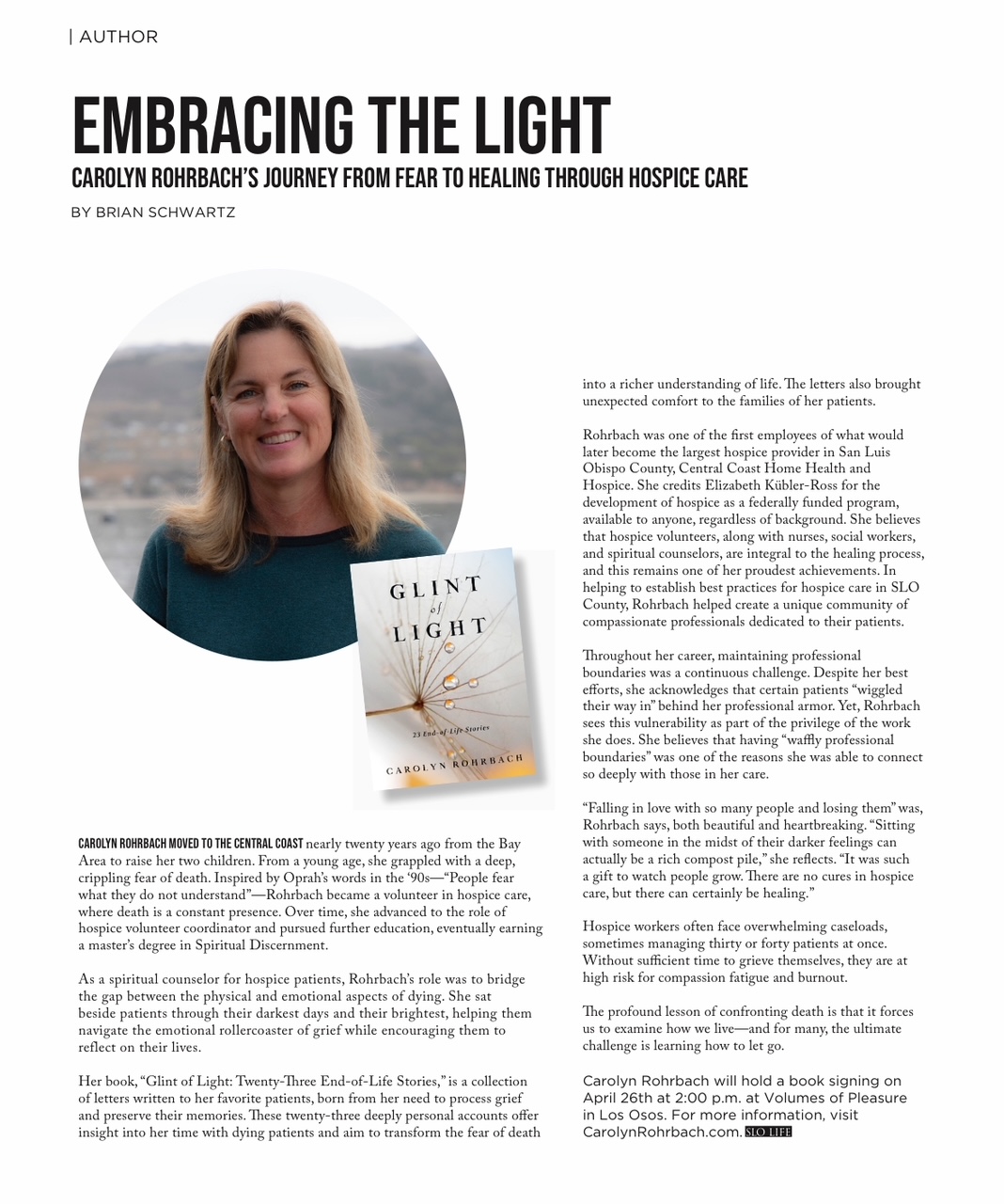 In my book, Glint of Light: 23 End-of-Life Stories, I share real encounters from the hospice bedside—moments of grace, grief, humor, and transformation. These stories invite readers into tender conversations about death and dying, and help illuminate the spiritual dimensions of letting go.